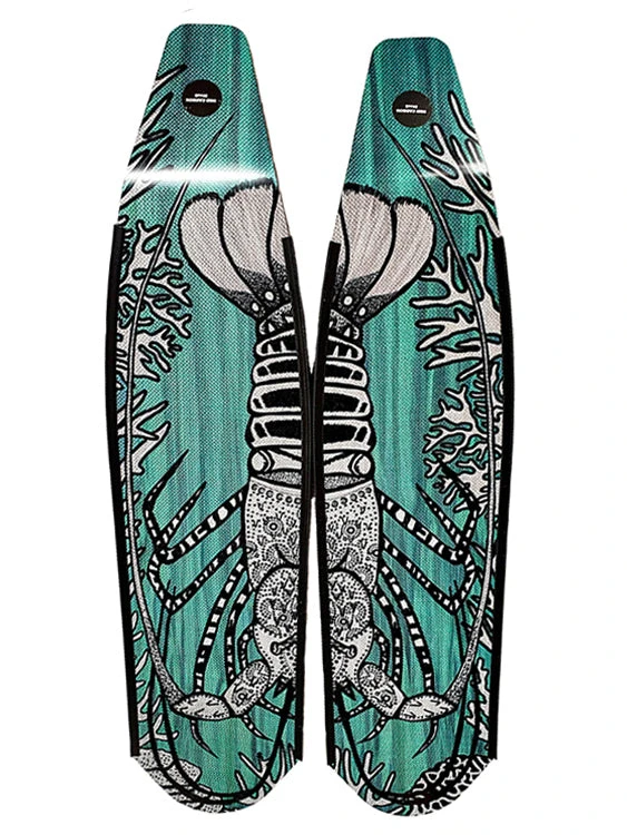 DiveR Freediving Fin Blades are made by hand for precision and their stunning designs. The intricate design of the black and white Cray Fish on these blades is beautiful and contrasts perfectly with the aqua background. The two blades next to each other create the full design with which you will certainly stand out.