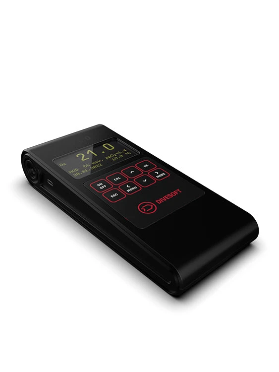 The unit comes with a rechargeable Li-Ion battery that is supplied with a USB-C cable. It has a streamlined design to fit comfortably in your hand and is upgradable to a Helium analyser by adding a solid state Helium sensor (the upgrade is performed by Divesoft).