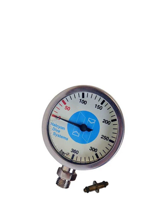 The Halcyon stage SPG has a nickel-plated brass body with an acryllic lens, to make the gauge light weight. The lighter weight and smaller profile makes these gauges ideal for use with stages and deco bottles.