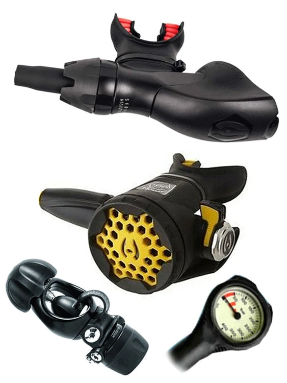 A great regulator set, for beginners and dive pros alike: the Hollis DC7 first stage + 500SE second stage + LX150 octopus & free termo gauge. This combo is especially useful in harsh dive environments.