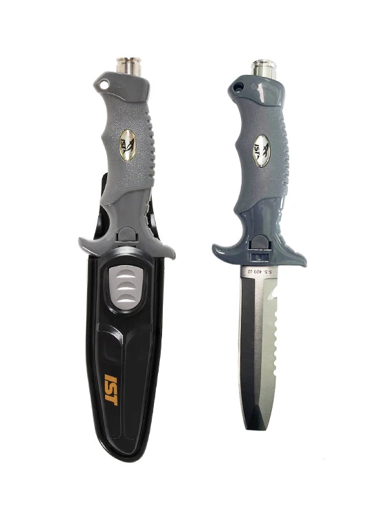 The IST K10 (Point) and K11 (Blunt) Dive knives are a marine grade stainless steel dive knife, with serrated edge, smooth edge and cutting notch capable of easily cutting through fishing nets or wire.