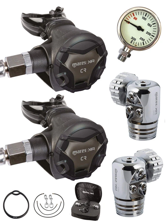 This set includes: 2x CR second stages, 2x 25XR first stages, 4 hoses (60cm HP hose, 60regulator hose, 54cm inflator hose and 210cm regulator hose), a pressure gauge, an elastic collar and 2 bolt snaps.