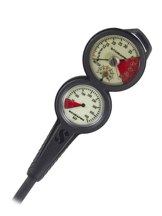 The Scubapro Compact SPG Twin holds the Scubapro Compct SPG. The SPG shows up to 400 BAR of pressure. The Scubapro Depth Gauge is oil-filled and uses the Bourdon Tube system to ensure you a detailed and trustworthy reading.
