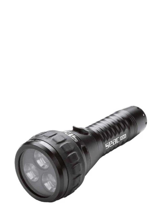 This is the SEAC Sub R30 Dive Light, an aluminum dive torch with tempered glass and a 1500 lumen output. A great companion for your diving adventures! The lamp itself is a 3 CREE XPG2 LED.