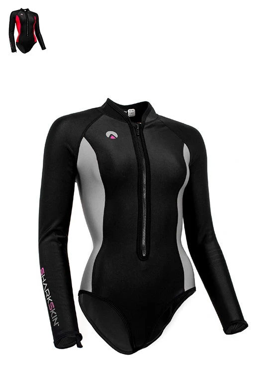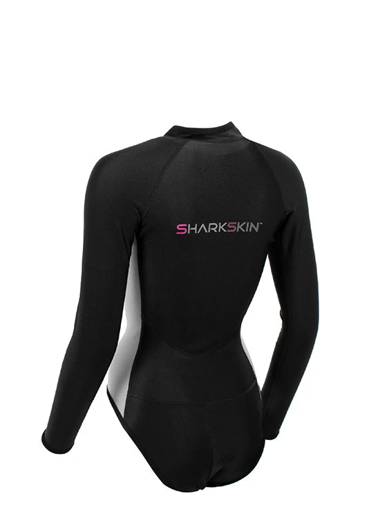 A new design from Sharkskin is the Chillproof Long Sleeve Step-In for women. The step-in design prevents the top from riding up, making it perfectly suitable to be worn without separate shorts. It also keeps the top in place, when donning a wetsuit on top, keeping your kidneys and lower back warm during a cold water dive. It also features a soft neoprene neck seal, to stop wind and water from rushing down your neck.