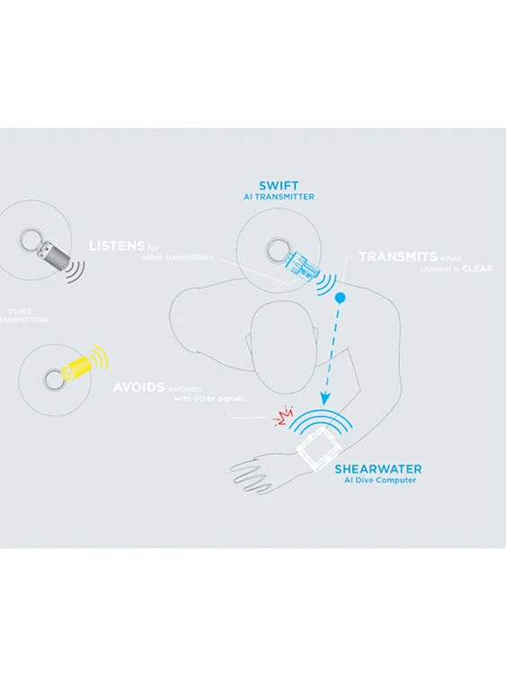 The Shearwater Swift Transmitter is the next generation of air integration transmitters that allows divers to carry multiple transmitters reliably.