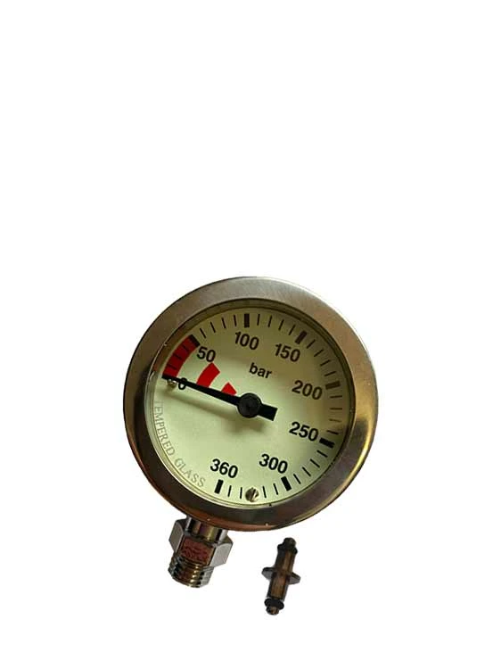 The 100% oxygen clean white faced (naked) brass and glass Termo SPG is the number one choice of technical divers. Heavy duty tempered glass face and a double chrome mirror plated case protect the gauge and the naked glow in the dark face makes this gauge very easy to read in the dark – ideal in wrecks and caves!